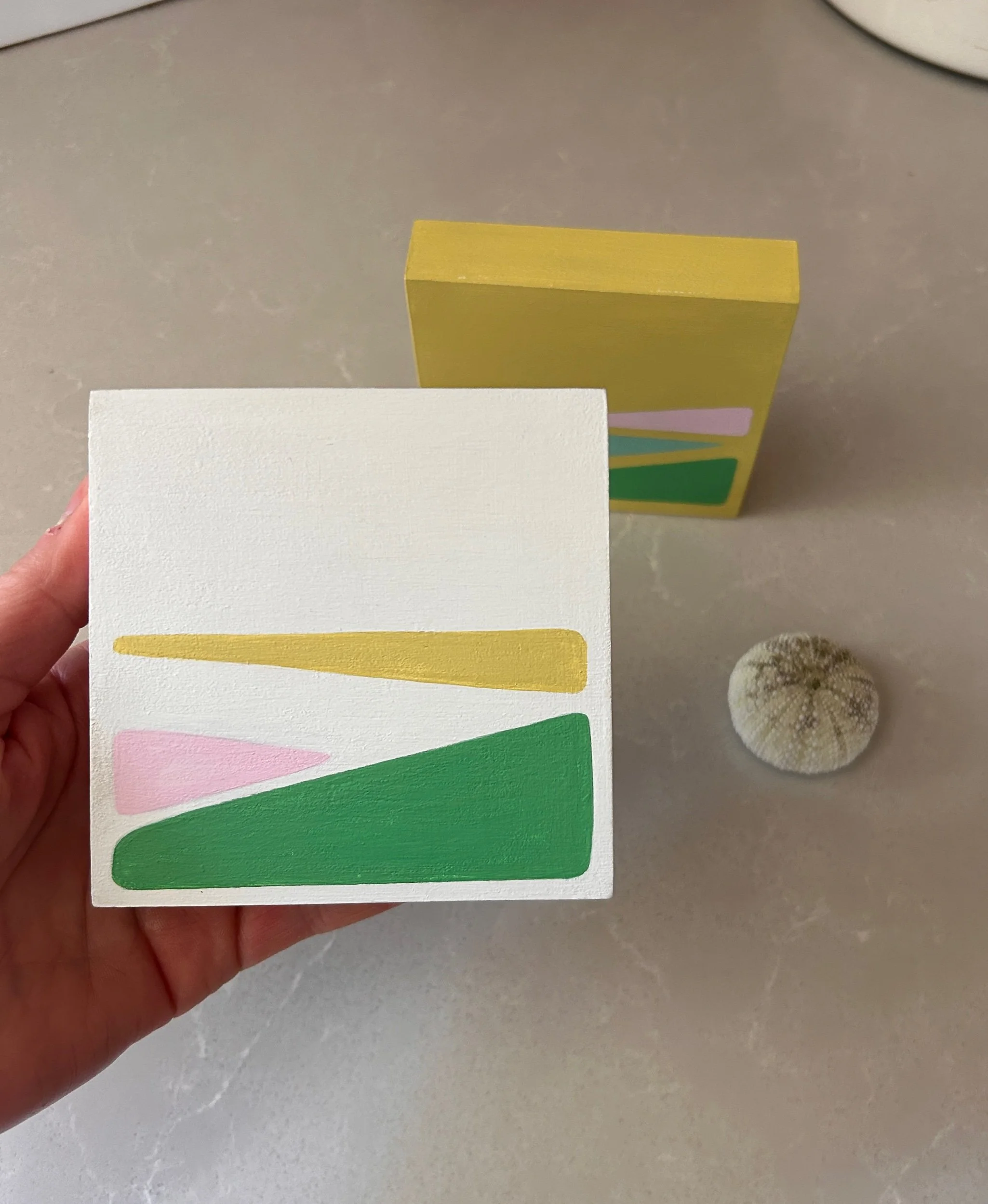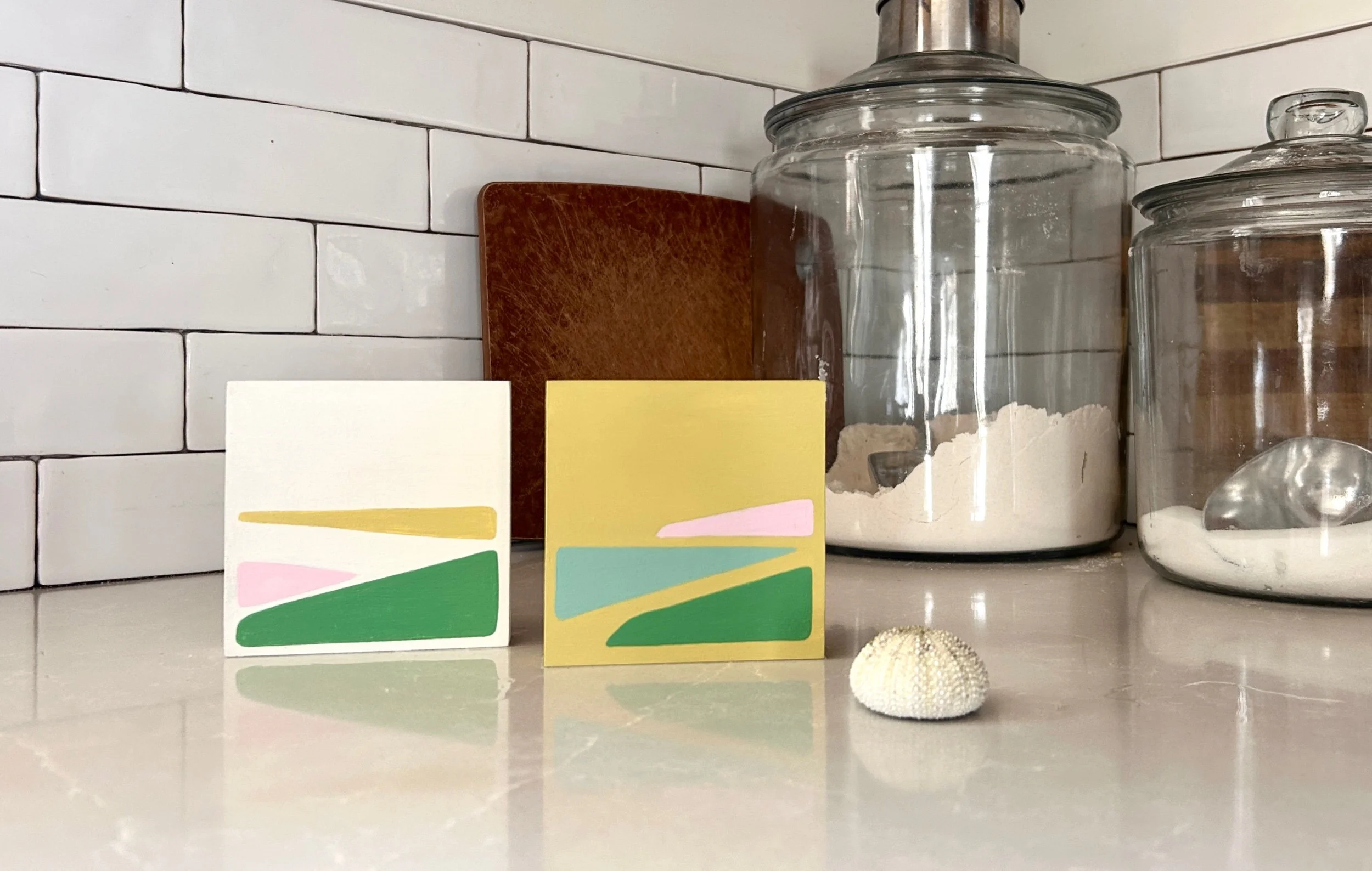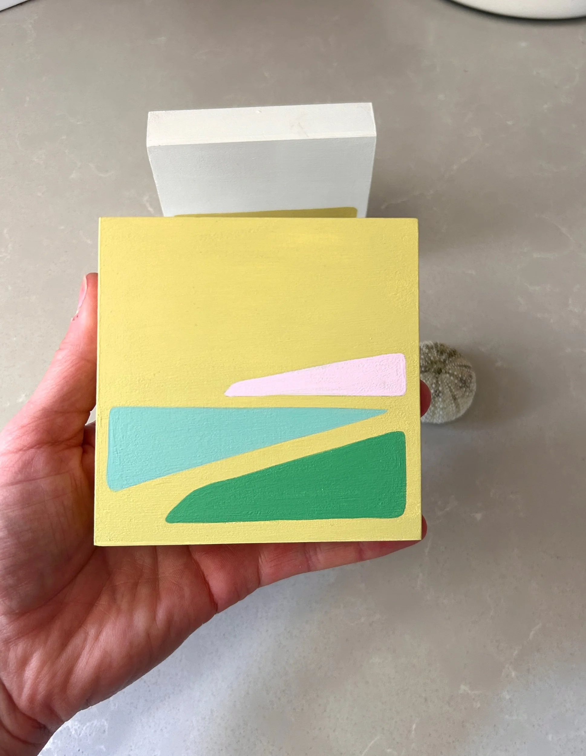 These minimal landscapes measure 4x4 inches. Hang on your wall or sit on a shelf, they come naked (unframed) and will add a pop of color to any corner of your home. Sold separately.